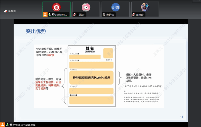单璐玉讲到,简历是求职的敲门砖,一份优秀的简历能够显著提升自己的就业机会。她从简历是什么、有什么、怎么写三个问题出发,分享了简历制作的基本原则,并结合实际案例,指导同学们挖掘个人亮点,避免常见错误,合理布局简历,突出自己的能力和求职意向的匹配度。接着结合自己的简历讲解,为大家提供了参考的模板。